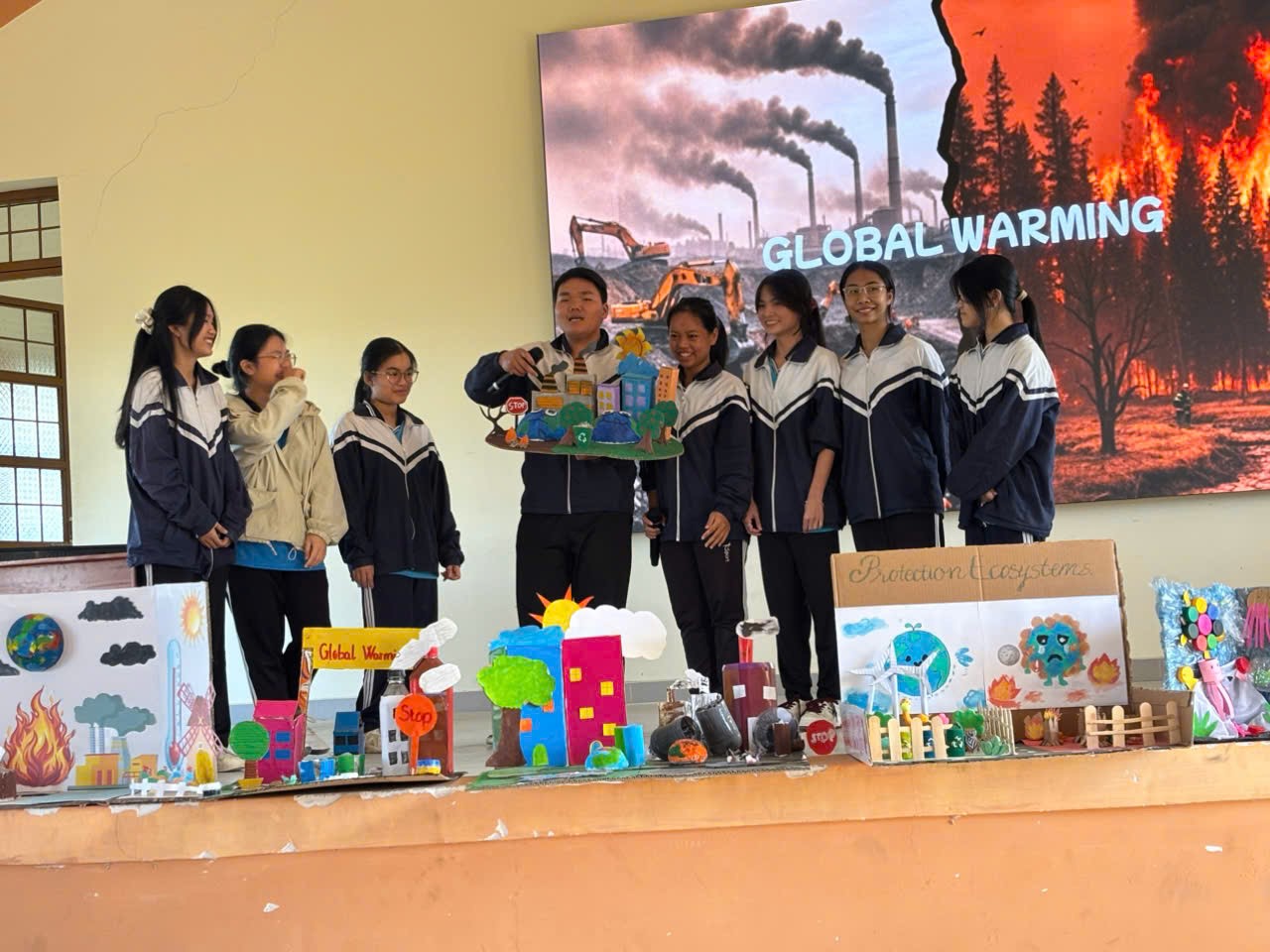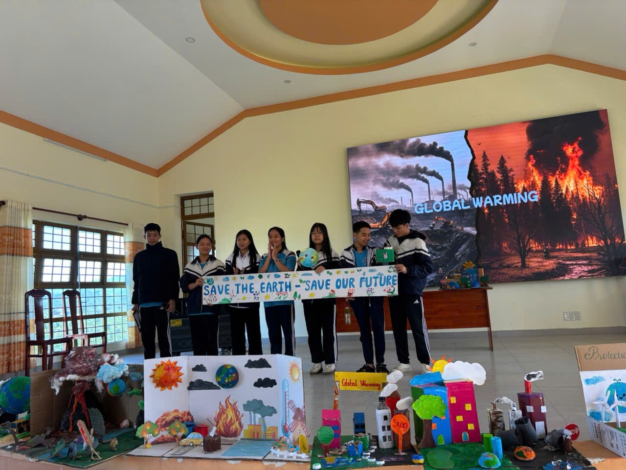 Điểm nổi bật của buổi sinh hoạt là phần thiết kế mô hình minh họa cho hiện tượng nóng lên toàn cầu. Các nhóm học sinh đã mang đến nhiều sản phẩm trực quan, sinh động như mô hình Trái Đất bị băng tan, rừng bị tàn phá, nhà máy thải khói, môi trường biển ô nhiễm… Mỗi mô hình đều thể hiện sự đầu tư nghiêm túc, tư duy sáng tạo và khả năng vận dụng kiến thức thực tiễn của học sinh.